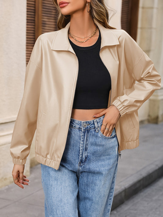 Graceful Special Edition Women's Solid Color Zip-Up PU Casual Long Sleeve Jacket