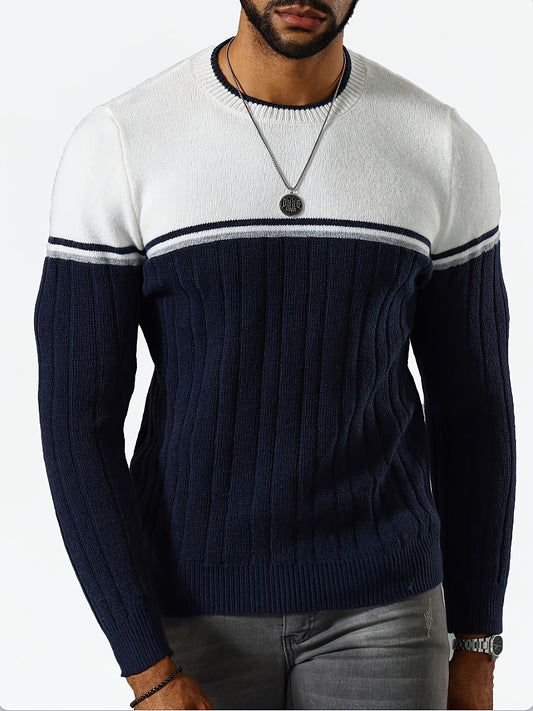 Men'S Autumn Winter New Round Neck Sweater | Color Block Design, Casual Versatile Top, Acrylic Fabric with Slight Stretch