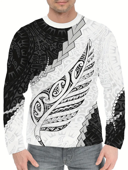 Men'S Comfortable Vintage Maori Silver Fern Pattern Long-Sleeve Crew Neck Pullover, Suitable for Spring And Autumn