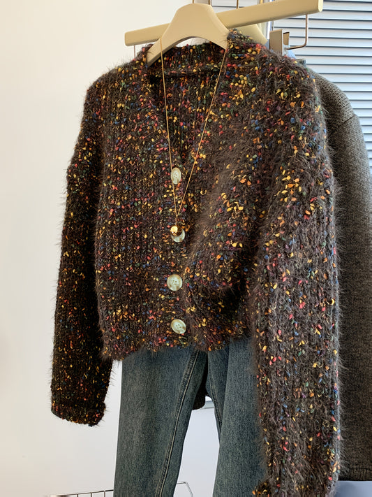 Women's Vintage Multicolor Tie-Dye V-Neck Soft Sweater Coat - Cozy Winter Jacket with Button Closure, Plush Collar & Relaxed Fit, Brown Base with Multicolor Patterns for Fall and Winter Layering (Hand Wash/Dry Clean)
