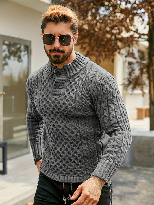 Men's Thermal Stand Collar Cable Knit Sweater - Striped H-Shape Regular Fit Pullover, Machine Washable Winter Sweater with Ribbed Detailing for Autumn & Winter, Knit Sweater, Medium Elasticity Fabric