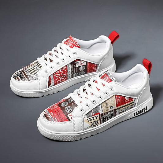 Men's Casual Sneakers with Vintage Beverage Label Print - White Red Accents, Breathable PU Upper EVA Cushioned Sole, Low-Top Lace-Up Design for All-Season Comfort, Urban Streetwear Style, Comfortable Footwear Fabric Lin
