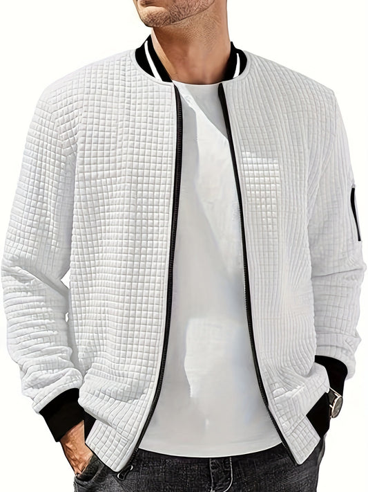 Men's Casual Bomber Jacket with Stand Collar - Polyester and Elastane Blend, Knit Fabric with Slight Stretch, Solid Color, Zipper Detail, Long Sleeve, Regular Fit
