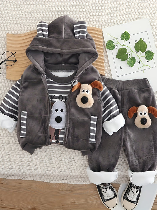 BABICOLOR 's Winter 3pcs Dog Print Hooded Jacket & Pants Set - Warm Loose-Fit Outfit, Winter Clothing for 1st Photoshoots, Casual Cold-Weather Outwear, Perfect for Outdoor