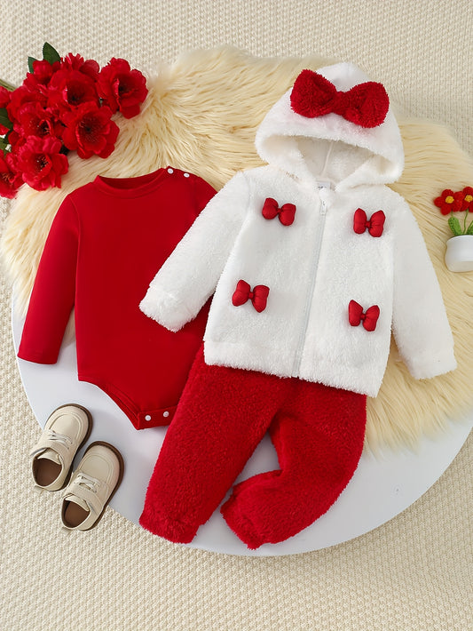 3pcs Girls' Winter Pants Set with Long Sleeve Bodysuit, Red Bow Decorated Zip-Up Hoodie + Casual Elastic Waist Pants, for Outdoor