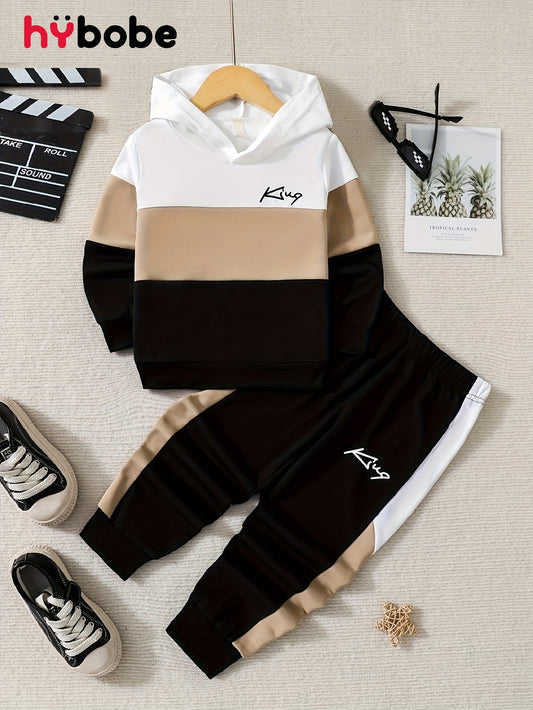 2pcs Boy's "King" Print Hooded Outfit, Stylish Colorblock Stitching Hoodie & Pants Set, Kid's Clothes For Fall/Winter Outdoor Wear, As Gift