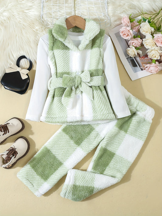 3pcs Plush Set Girl's Plaid Teddy Vest + Long-Sleeve Top + Teddy Pants, Casual outdoor Style Girls Winter/ Fall Clothes, Gift