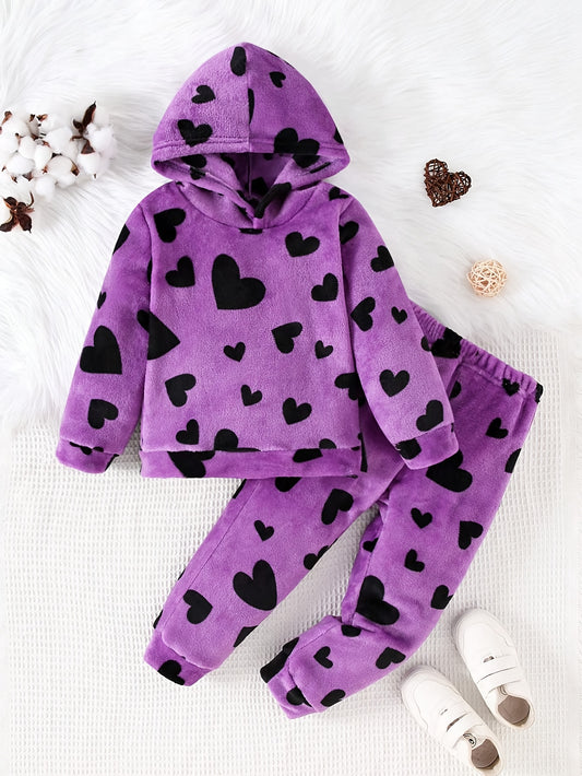 ' Cozy Fleece Hooded Sweatshirt & Pants Set - Warm Winter Outfit with Heart Pattern, Long Sleeve Pullover & Matching Pants, Perfect for Outdoor Play, Casual Style, Regular Fit, Winter Clothes for , Playful Design, Soft Textur