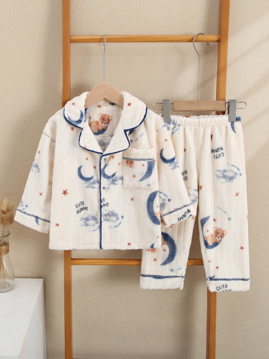 2025 New Autumn And Winter Boys' Home Clothes Two-Piece Baby Pajamas Set Flannel Thick Velvet Thickened Moon Bear Pattern Pocket Button Style Cold-Proof Thermal Underwear