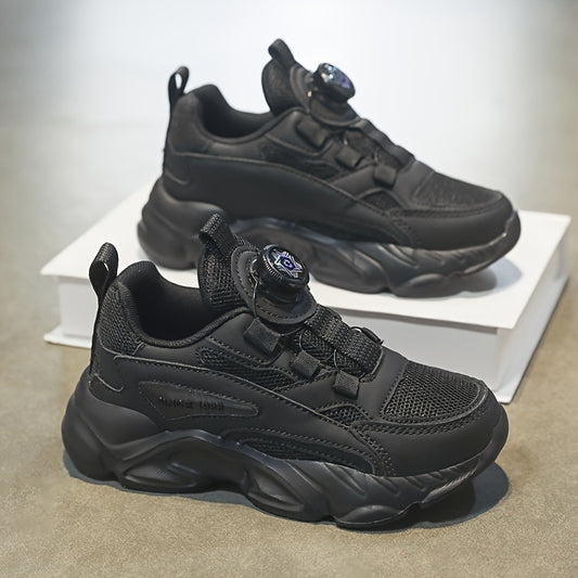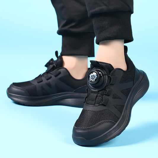 • [Backtoschool Essential] Youngsters' Breathable Mesh Running Shoes with Rotating Buckle - Lightweight, All-Season Sneakers for Boys & Girls, Black, Casual & Sporty Design for School, Outdoor Activities & Casual Attire, Casual