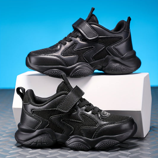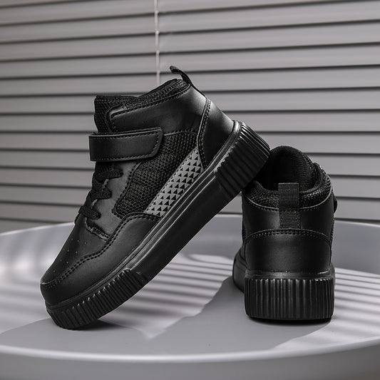 • Youngsters' Black Mesh & PU High-Top Sneakers with Diamond Pattern - Breathable, Durable, Lightweight EVA Sole & Adjustable Hook-and-Loop Closure for School, Outdoor, Training - All-Season Versatile Play Shoes for Boys & Girl