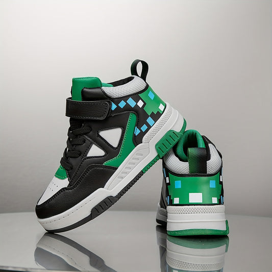 • Youngsters' High-Top Sneakers with Hook-and-loop Fastener Closure - Vintage Geometric Print, Breathable & Non-Slip for Boys and Girls - Perfect for Running & Casual Wear