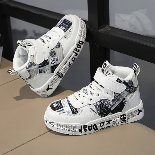 Youngsters' High-Top Sneakers with Hook-and-loop Fastener Closure - Vintage Geometric Print, Breathable & Non-Slip for Boys and Girls - Perfect for Running & Casual Wear