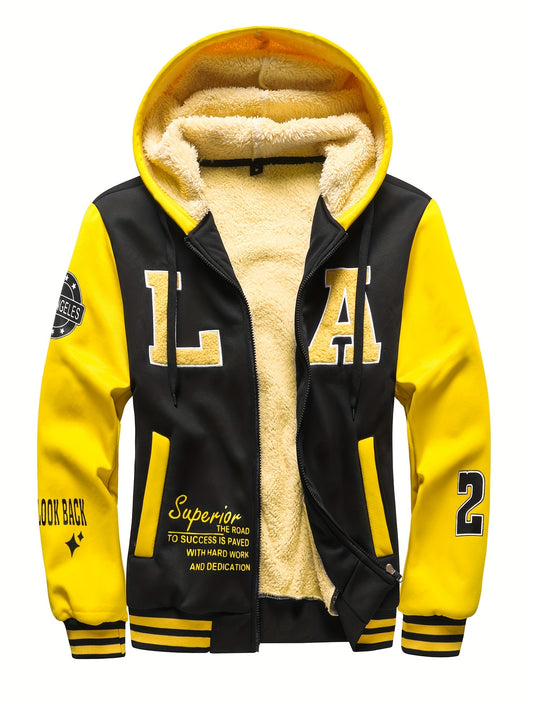 Men'S Cozy Fleece-Lined Hooded Jacket with "LA" Lettering - & Yellow Color Block, Zip-Up Casual Outerwear, Long Sleeves, Pockets, Perfect for Fall & Winter, Casual Winter Wear | Hooded Jacket | Zippered Jacket