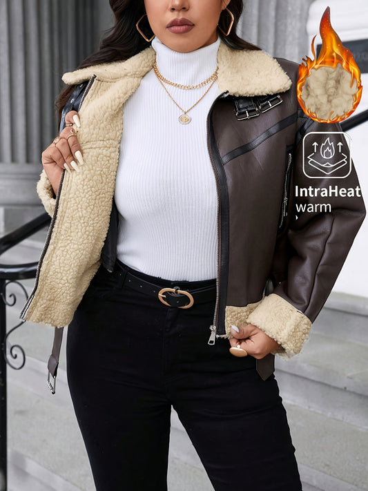Plus Size - Plus Size - Plus Size Women'S Elegant Faux Fur-Lined Motorcycle Jacket - Coffee Brown & Black Color Block, Zip-Up Short Length with Lapel Collar, Regular Sleeves, Non-Stretch Fabric for Winter Warmth, Winter Jacke