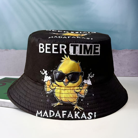 1pc Summer New Arrival Beer Time Duck Print Reversible Bucket Hat - Fun Beach & Streetwear, Sun Protection, Lightweight Polyester, Black with Colorful Graphics, Reversible Fashion | Street Style Hat | Woven Texture