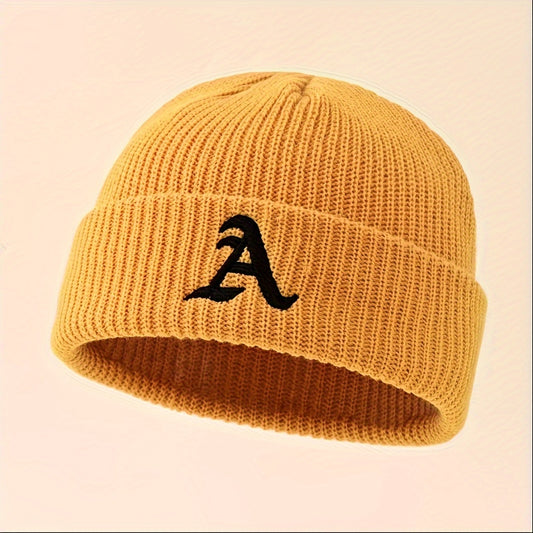 1pc Unisex Classic Brimless Hat With Adjustable Rolled Cuff, Simple Letter Pattern Knitted Hat, Suitable For Winter Daily Wear
