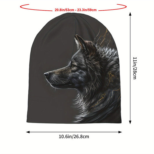 Night Moon Wolf Realistic Wolf Head Design Skull Cap Beanie Hat - Black Unisex Hip Hop Fashionable Winter Hat for Men & Women, Cold Weather Accessory, Stylish Headwear, Highquality Print