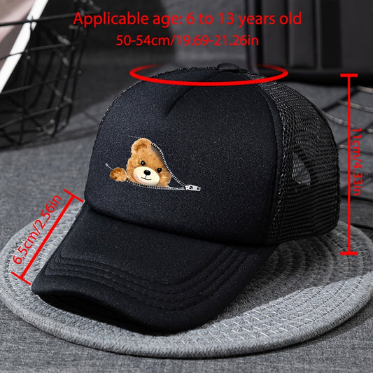 Kids' Breathable Mesh Baseball Cap with Teddy Bear Design - Adjustable Snapback, Sun-Protective Trucker Hat for Boys & Girls, Black