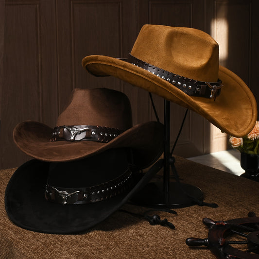 Western Cowboy Hats for Men And Women, Classic Faux Suede with Metal Studs And Bull Pattern, Lightweight Unisex Festival Occasion Hat, Woven Inelastic Polyester with Decorative Accessories, No Feather, Non-Washable