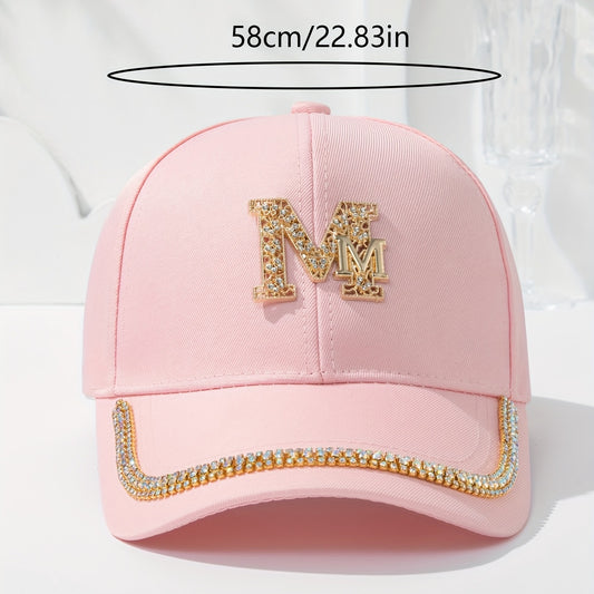 Women's Fashion Patch Baseball Cap With Metallic "M" Initial, Rhinestone Accents, Adjustable Snapback Cps, Wide Brim Sun Hats