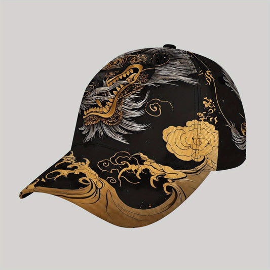 Stylish Dragon & Floral Print Baseball Cap - Breathable Lightweight Unisex Hat for Outdoor Sports, Casual Wear & Lunar New Year Festivities, Black with Golden/White Accents, Festive Headwear, Vibrant Patterned Cap, Comfortabl