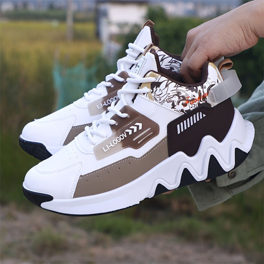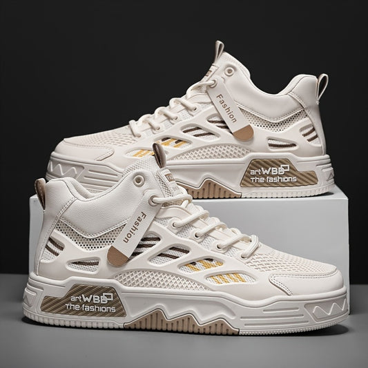 Men's High Top Fashion Sneakers Graphic Print Lace-Up Casual Skateboard Shoes with Round Toe, PU Mesh Upper, Fabric Lining, and Rubber Sole