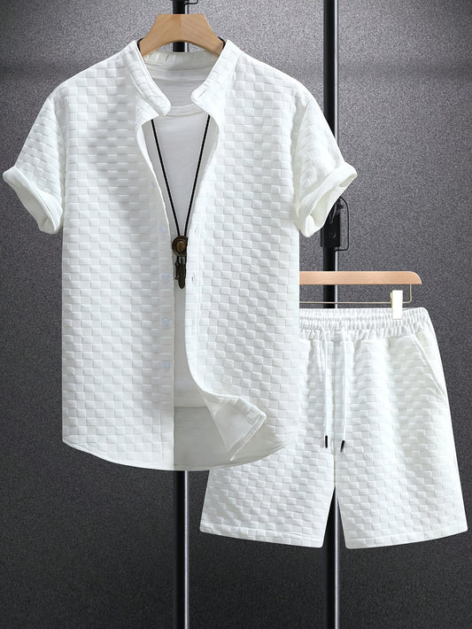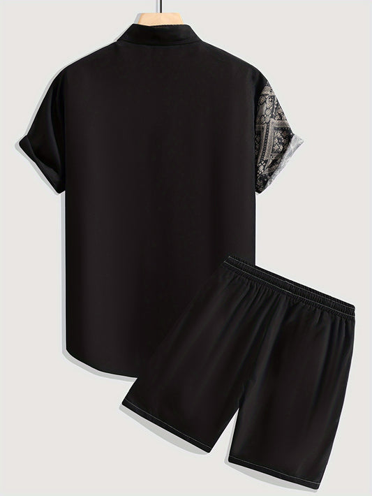 Men's Outfit, Casual Geometric Print Lapel Short Sleeve Button Up Shirt With Chest Pocket & Drawstring Shorts 2-piece co ord set For Outdoor Activities