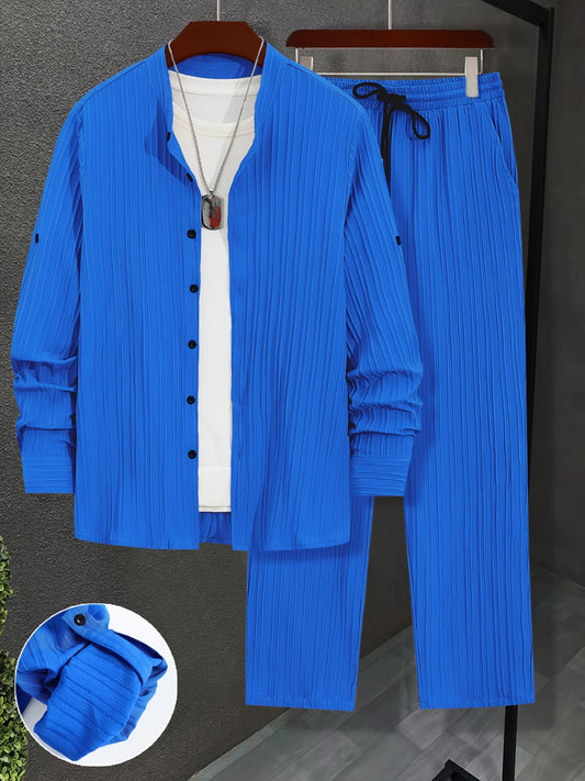 Men'S Two-Piece Set Featuring Textured Fabric, Versatile Long-Sleeve Shirt with Ear Loops, And Loose Drawstring Casual Pants.