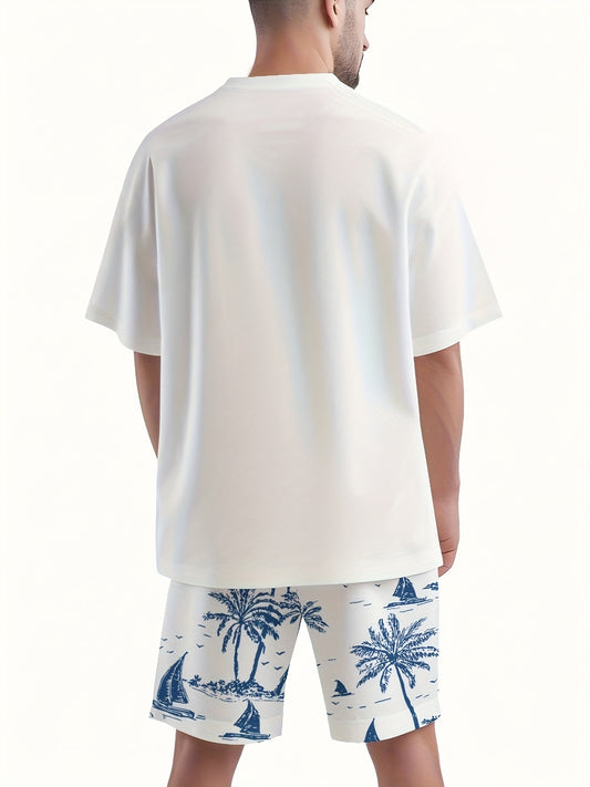 Men's 2025 Summer New Short Sleeve Shorts Set: Beach Casual 3D Coconut Tree Print, 2pcs Fashionable Palm Pattern T-Shirt and Shorts with Slight Stretch Polyester Knit Fabric, Slim Fit for Outdoor Activities & Family Gathering