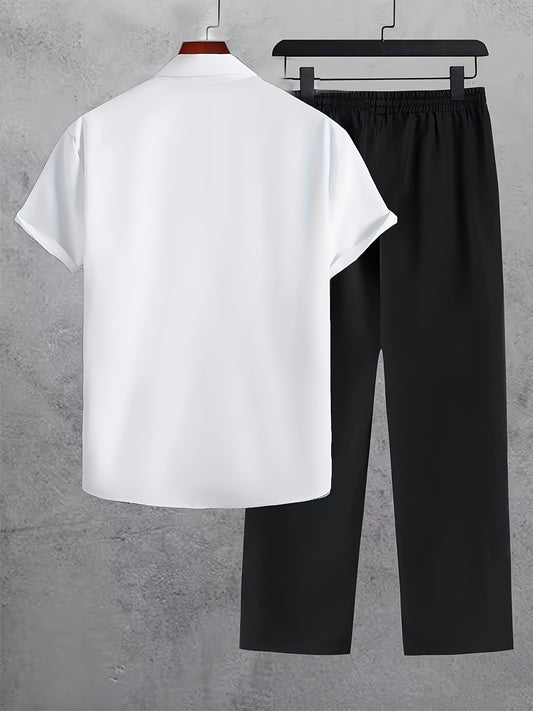 Men'S Casual Short Sleeve Button-Up Shirt & Shorts Set - Solid Black, Breathable Polyester Blend, Regular Fit for Summer, Everyday Comfort, Casual Summer Wear | Buttonup Shirt | Polyester Blend
