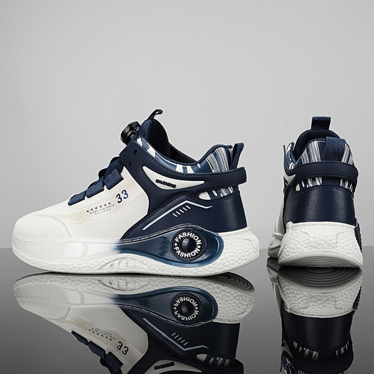 [Athletic Performance] Men's Breathable Casual Sneakers - Stylish Loafers with Rotating Buckle, Navy Blue White Design, Comfortable PU Upper PVC Sole for Casual Attire, Running, and Outdoor Activities