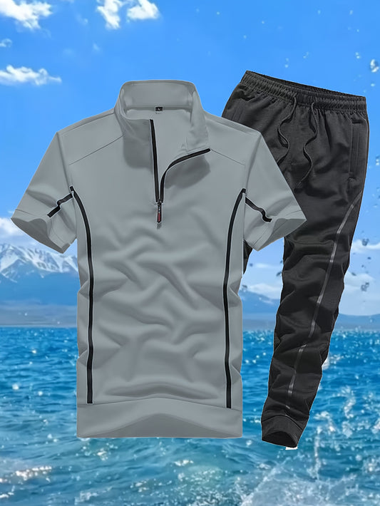 Men'S Casual 2pcs Set Knitted: Zipper Short Sleeve Shirt and Drawstring Pants - Black, Polyester, Suitable for Spring/Summer Casual Wea