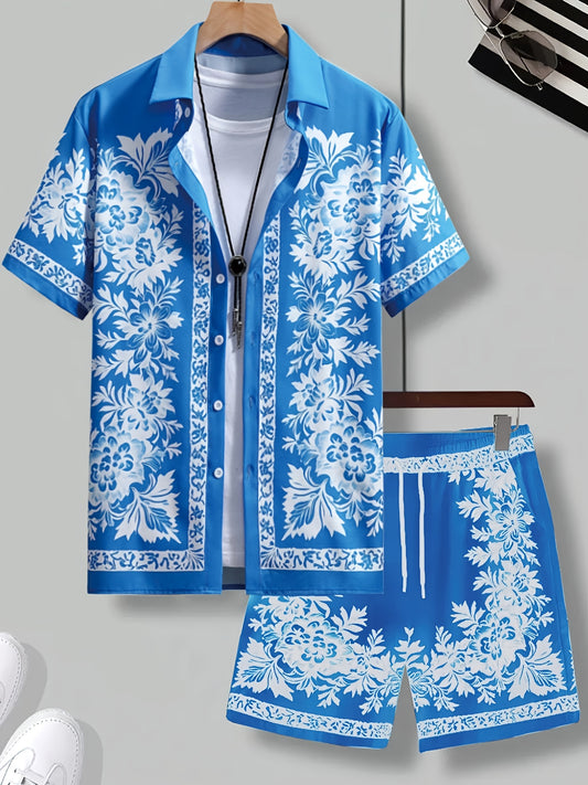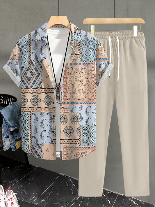 2pcs Summer Men'S Print Shirt and Pants Set Vacation 2pcs Suit, Perfect for Outdoor