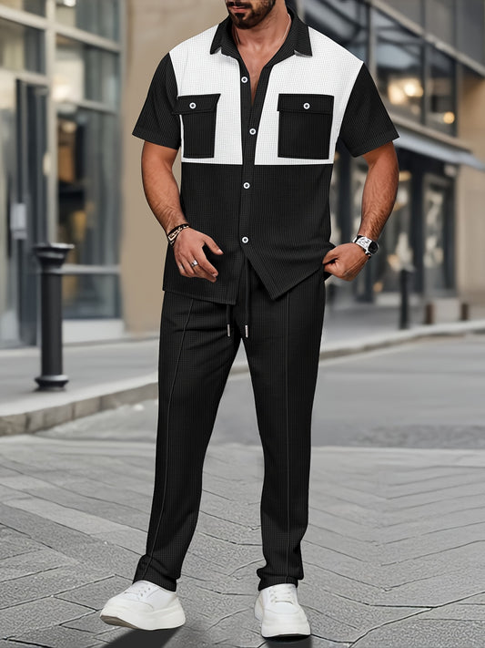 Men's Summer Two-Piece Set, Waffle Fabric Contrast Color with Pockets Short-Sleeved Shirt + Casual Trousers Suit, Leisure Light Business Vacation Daily Multiple Scenes