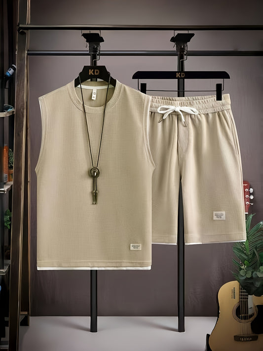 Summer Men's waffle vest set, casual fashion fake two-piece sleeveless vest and casual shorts two-piece set, sports set, breathable, soft and comfortable