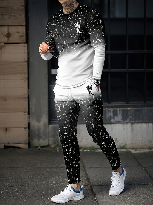 2pcs Men's Gradient Color Random Patter Long Sleeve T-shirt + Pants Set, Casual Co-ord Set For All Seasons