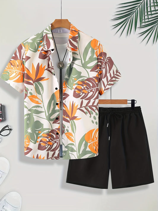 Men'S Tropical Palm Leaf Print Short Sleeve Shirt & Solid Black Shorts Set - Casual Summer Outfit with Drawstring Waist, Non-Stretch Fabric, Perfect for Beach or Vacation, Beach Attire | Tropical Print Shirt | Nonstretch Fabr