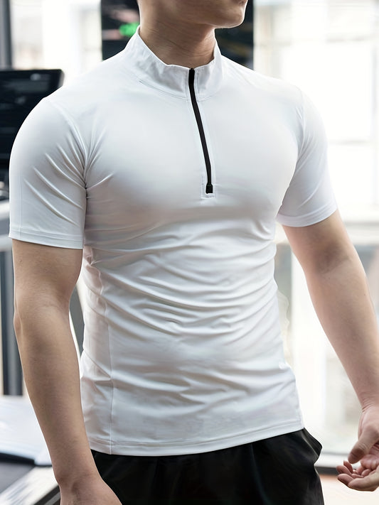 Men's Summer Quick-Dry High Neck T-Shirt - Moisture-Wicking Stretch Fabric, Slim Fit Athletic Top for Gym, Running Training - Solid Color Breathable Workout Shirt, Gym Clothes