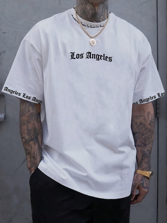 OBM Men's Casual Los Angeles Graphic Print T-Shirt - 100% Polyester Summer Short Sleeve Tee, Breathable Round Neck Regular Fit Machine Washable, Everyday Comfort, Bold Text Style, Smooth Texture