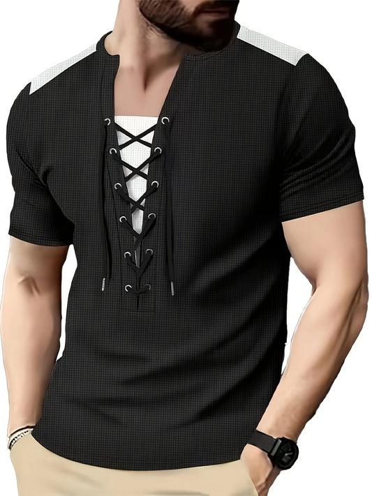 Men'S Casual Waffle Knit Short Sleeve T-Shirt with Drawstring Detail - Maroon Black, Round Neck, Breathable Polyester Fabric for Summer Outings, Casual Weekend Wear Round Neck Tee Stylish Contrast Stitchin