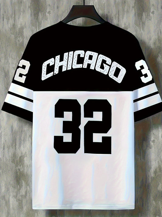 Men's Chicago 32 Graphic T-Shirt - Sporty Casual Short Sleeve Tee with Full-Body Print, Round Neck, Black White Color Block Design, Machine Washable Summer Top for Outdoor Casual Attire, Chicago T Shirt, Digital Print Shi