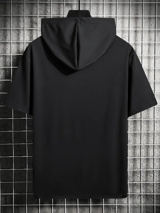 1pc Twisted Cool Men's Hooded Short Sleeve T-Shirt - Solid Black Casual Streetwear, Regular Fit, Hand Wash Only, Summer Essential for Everyday Comfort