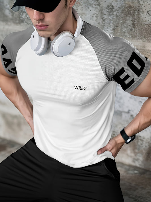 Men's Quick-Dry Breathable Mesh Sports T-Shirt - Summer Gym Workout Top with Contrast Black White Sleeves for Man Letter Print, Slim Fit for Running Training Casual Wear, Breathable Running Gear Sporty Casual Tee Mesh