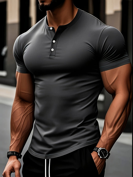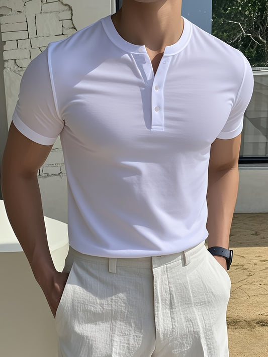 Men's Summer Classic Raglan Henry Collar Casual T-Shirt - Breathable Solid Color Short Sleeve Tee, Regular Fit for Casual Attire, Casual T Shirts, Twotone Design, Comfortable Fit Shirt