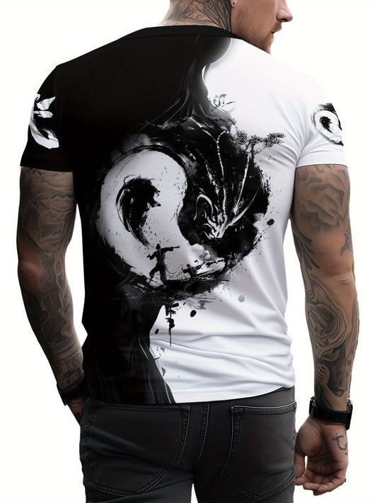 Men'S Yin Yang 3D Print T-Shirt - Casual Crew Neck Polyester Tee, Slight Stretch Knit Fabric, Regular Fit, 100% Polyester Fiber, 100g/m²