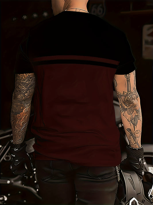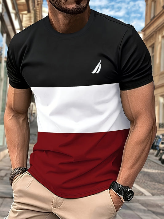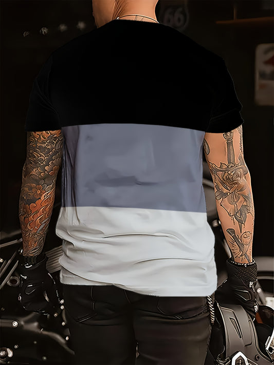 Men's Round Neck T-Shirt, Three-Color Patchwork Top with Asymmetric Double Stripes, Trendy Comfortable Breathable High-Quality Factory-Made Casual Fit