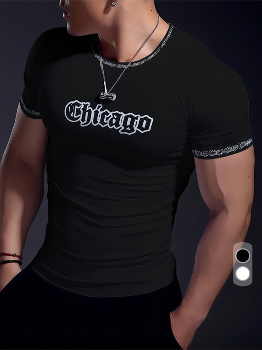 Men'S Chicago Print T-Shirt, Polyester-Spandex Blend, Crew Neck, Short Sleeve, Geometric Pattern, High Stretch, Tear Resistant, Sports Casual Style, Summer Fit Top for Training, Yoga, Hiking Festive Occasions
