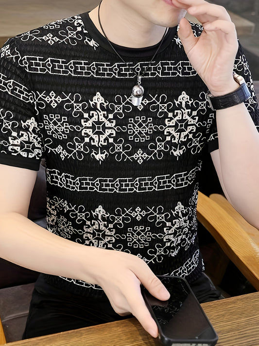 Men'S Vintage-Inspired Geometric Pattern Short Sleeve T-Shirt - Black White Contrast, Regular Fit Crew Neck, Summer Casual Tee for Men, Casual Attire Contrast Color Design Nonelastic Material