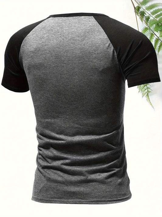 Men's Summer Casual Raglan Color-Block T-Shirt - Contrast Black/Grey Sleeves, Breathable Round Neck Short Sleeve Tee for Streetwear, Beach Outdoor Activities, Beach T Shirt, Comfortable Fit Shirt, Streetwear Fashion, Minima